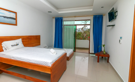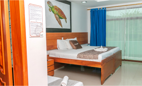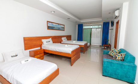 La habitación triple familiar, con una cama matrimonial y otra individual, destaca por su frescura y amplitud, proporcionando un espacio ideal para una estancia relajante.